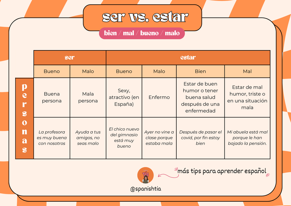 🧩 Tabla guía: SER vs ESTAR + bien / bueno / mal / malo